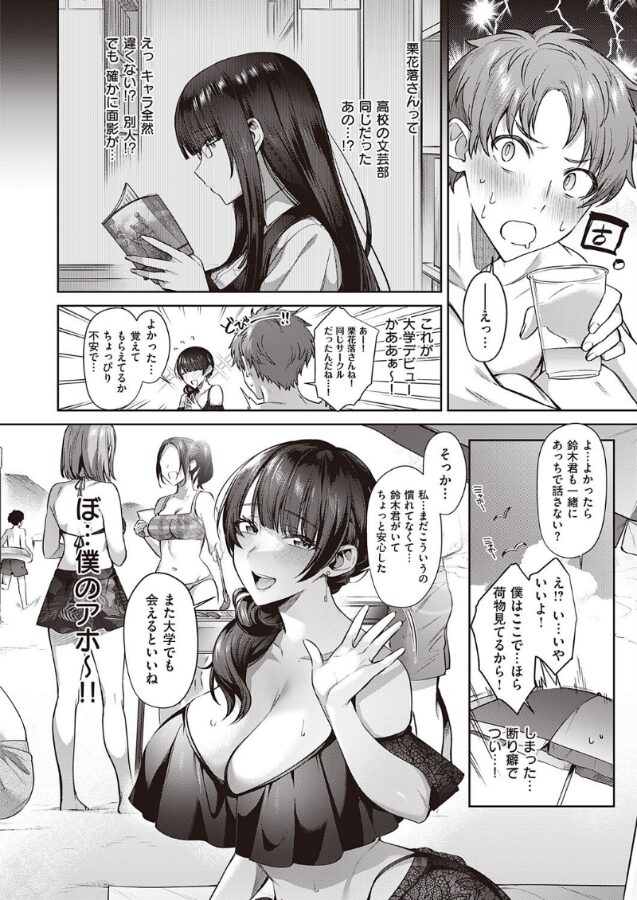 ●校時代、文芸部で控えめだった黒髪巨乳・栗花落さんと偶然同じサークルに入り奇跡の再会を果たした鈴木☆JDになってさらに垢抜けて社交的になった水着姿の栗花落さんに見惚れていると、しつこいナンパ野郎が近づいてきた――!?勇気を振り絞って栗花落さんを助けた鈴木は、逃げ込んだ先のトイレで栗花落さんから胸を押し付けられて積年の想いまで告げられちゃった!そんな健気なアプローチに、同じ気持ちを抱えていた鈴木との両思いエッチが始まって――♪やわパイ名手・尻戦車先生描く、大学デビューで超絶美女に大変身!? 元地味文芸部のあの子をナンパから助けてそのまま…!?
