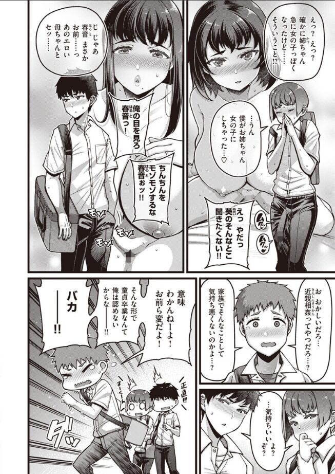 「……お兄ちゃんはこの年で妹とお風呂に入るのはおかしいって思わないんだ?」仲良い友達が近親姦で童貞卒業したことに驚きを隠せない正直(まさなお)。葵(あおい)はお姉ちゃんと、そして春音(はると)はお母さんと……。その話を一緒に入浴中の妹・素直(すな)に話したところ、今の状況もおかしなことだとツッコまれてしまう。妹は妹、だから性の対象にならない。そう思っていたけれど――。