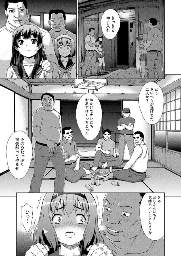 女子校生の一団が、バスの故障でとある村に迷い込んでしまった。そこは女を好きなだけ陵●しても良いという古い因習がある村だった!逃げ出そうとして捕まってしまった純華と亜弥は、純華が一人で複数の男たちを満足させることを条件に一人陵●されてしまう。容赦ない男達に処女マ〇コもアナルも犯●れていく!