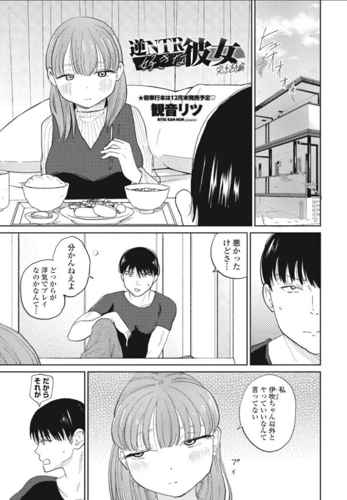 逆NTRが性癖でも許せない浮気のラインがある!そんな真剣な話し合いの最中にも彼氏は後輩のイタズラに屈して射精していた。もう理解し合うなんて無理なんだね。私たち別れよう。だけどフラれた彼氏の八つ当たりセックスを覗いちゃったらやっぱりお股がジンジンして…なんで私ってこんなに変態なのぉ…。新しい逆NTRのバイブル堂々のハッピーエンド!……観音リツ「逆NTR好きな彼女 完結編」