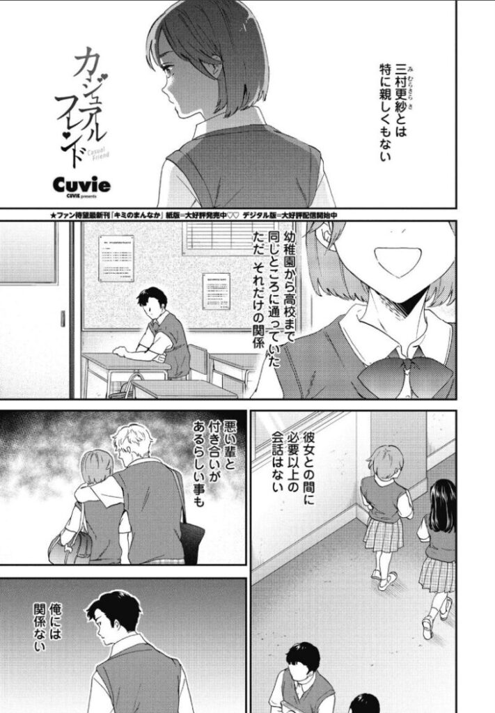たまたま幼稚園から同じだけってだけで会話だってろくにない幼馴染みの三村更紗。悪い先輩と『遊んで』いる彼女は『自分に惚れてる男を連れてこい』と命令され俺をハメ撮り現場に連れ込んだ。犬のように首輪をはめられち○ぽに狂う彼女を撮影しているうちに俺は…。……Cuvie「カジュアルフレンド」