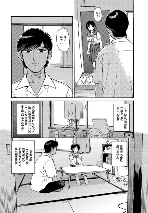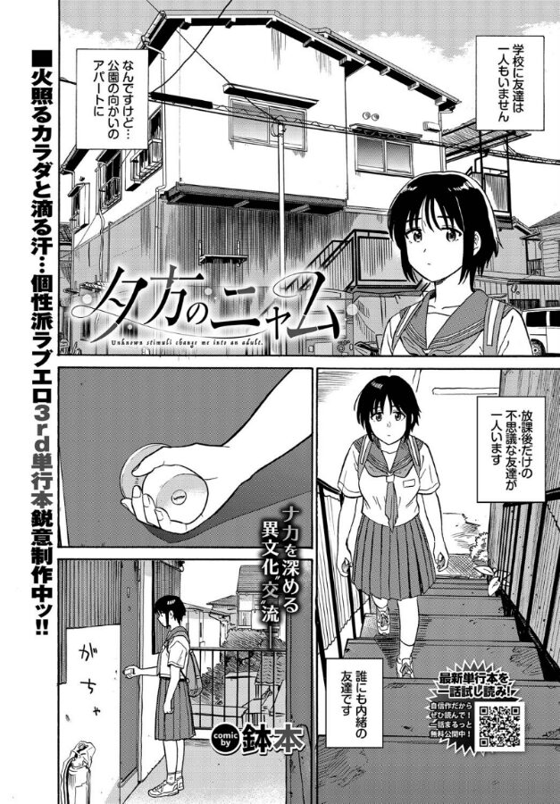 【放課後、夏、安アパートにて…火照るカラダと汗滴る初体験!】個性派エロス作家・鉢本が贈る、ちょっと不思議な異文化交流…♪学校に友達が一人もいない瓜子には、放課後だけの誰にも言えない友達がいた。それは外国からやってきたニャムという男の人で言葉はあまり通じなかったが、人と話すのが苦手だった瓜子にとっては逆に落ち着いて接することができた。そんなある日、瓜子はニャムの部屋でご飯を食べるとスパイスで汗が止まらなくなってくる。瓜子は大胆にスカートでパタパタと仰ぐと、ニャムが太ももに触れてきて…!?