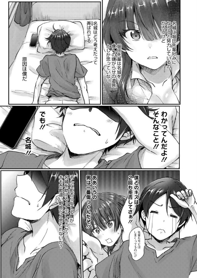 僕(日比野)と陰キャ仲間の名城は童貞と処女を捨てるため打算的にセックスをした。それからも二人の関係は変わらなかったが名城は徐々に垢抜けていき、それでも僕は何も言えないまま二人の関係は変わらず続いていく……。
