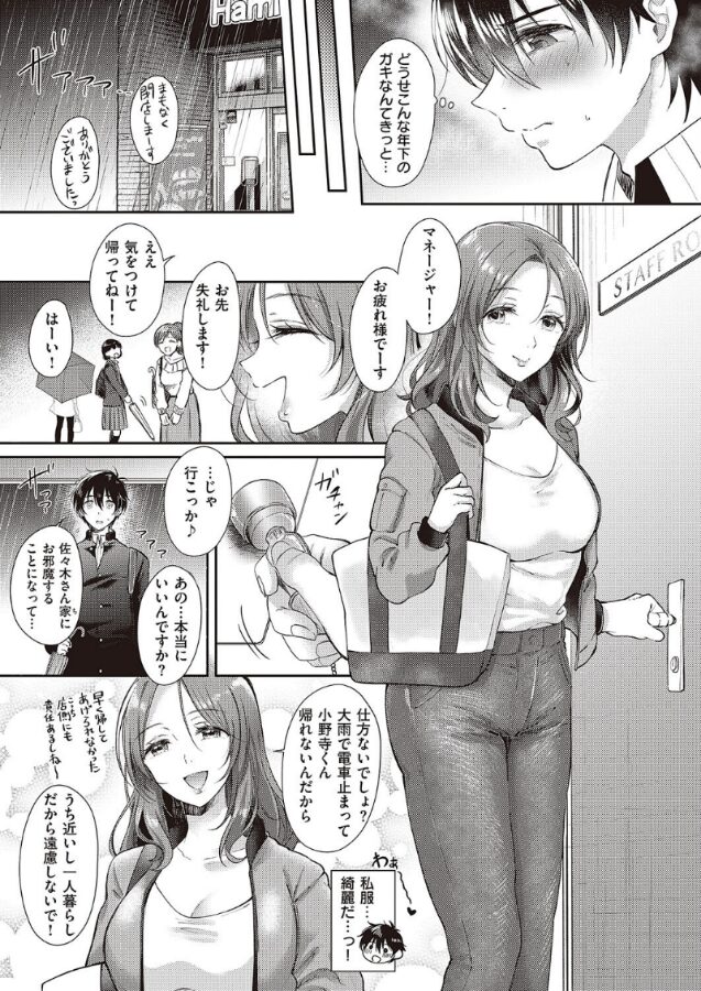 主人公・小野寺は、バイト先の巨乳美人マネージャー・佐々木さんと更衣室でSEXした日から身体の関係ができてしまう。佐々木のことが好きな小野寺は、年下だから遊ばれてるのでは…と、今の関係に悩み中。そんな時、大雨で帰れなくなった小野寺を佐々木が泊めてくれることになる。「じゃあここからお楽しみの時間ってコトで」と当然のように佐々木に誘われる小野寺だったが――!カワ淫お姉さんの申し子・源先生が贈る、妖艶上司とエッチ秘密の関係、後編!