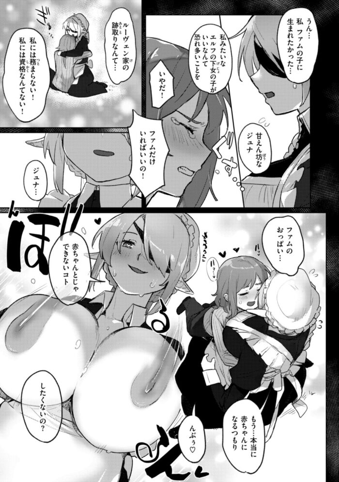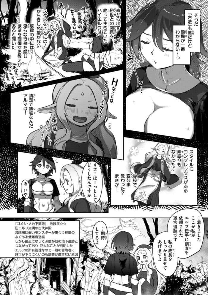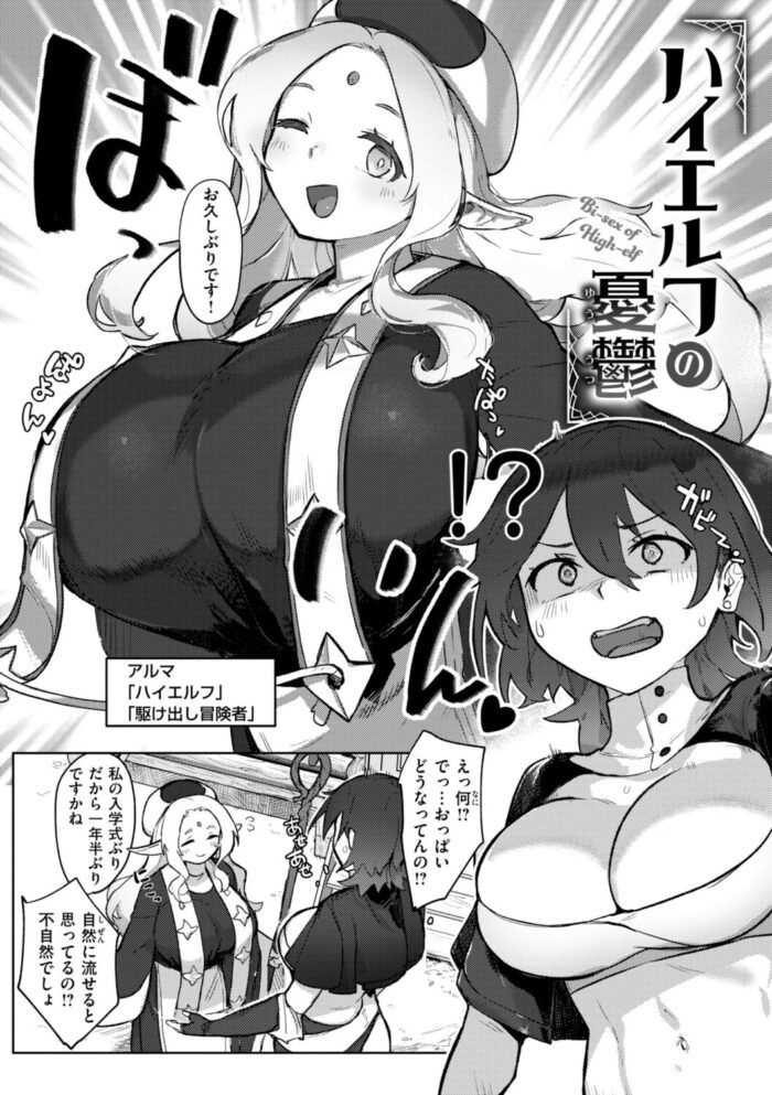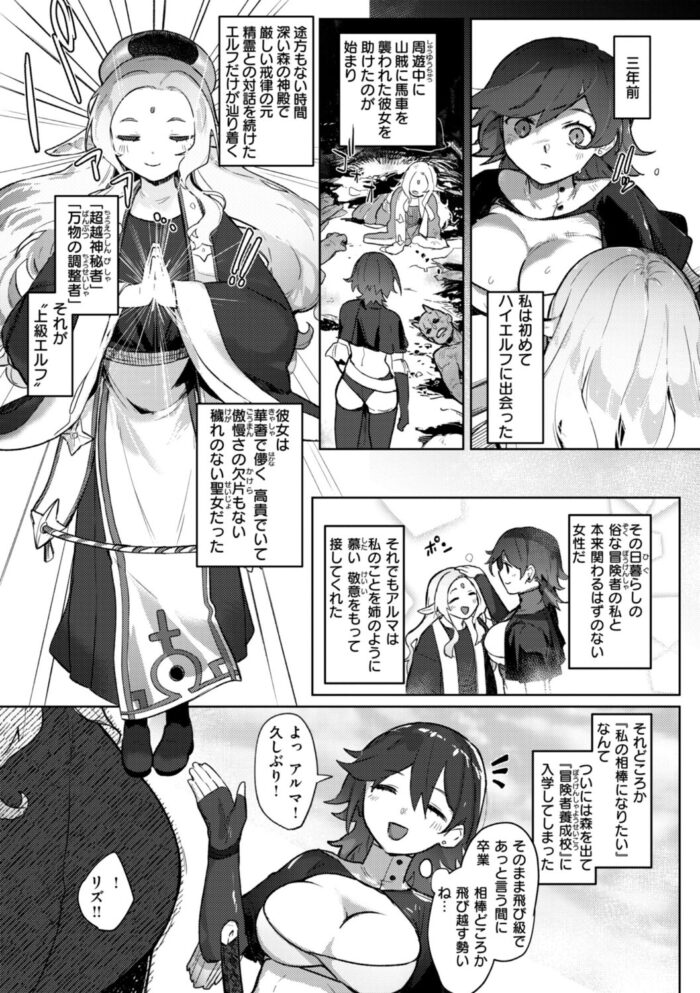 久しぶりに再会したハイエルフの冒険者仲間が爆乳女に変貌を遂げていた!? 彼女の想いを知り、おっぱいを愛し尽くすレズセックスへ♪『融淫落実』