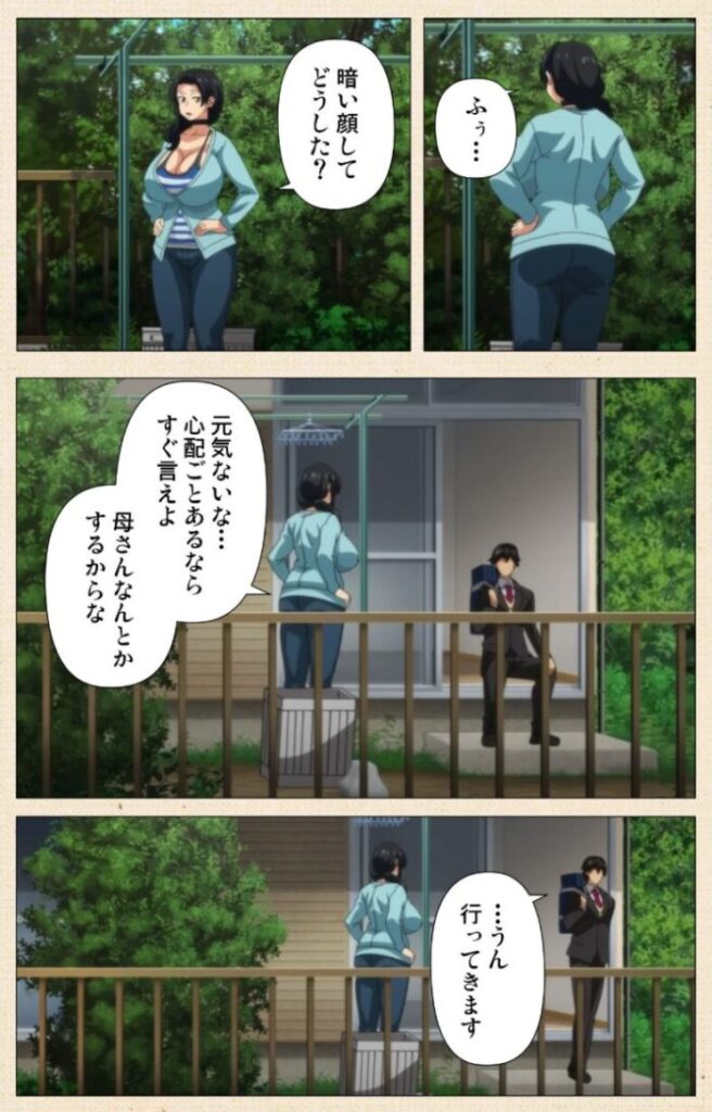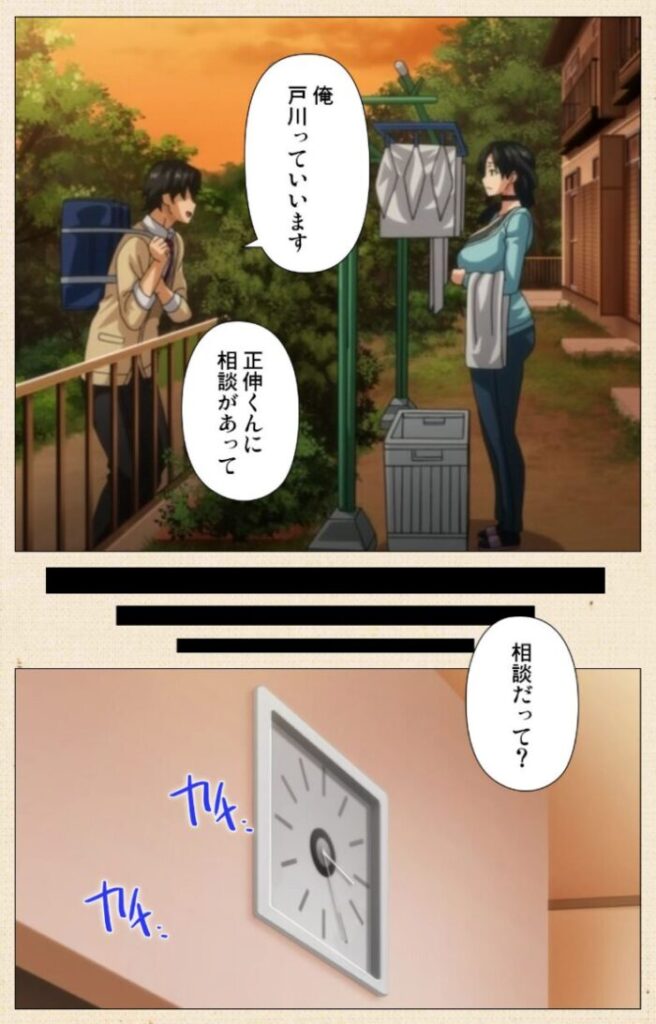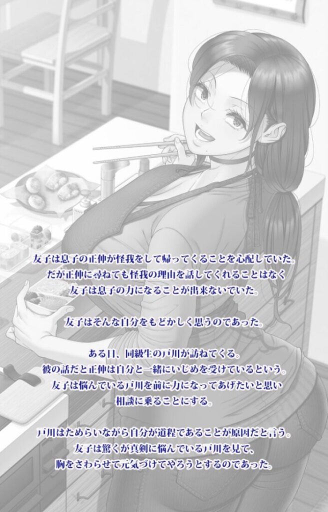 【フルカラー63ページ】友子は息子の正伸が怪我をして帰ってくることを心配していた。だが正伸に尋ねても怪我の理由を話してくれることはなく友子は息子の力になることが出来ないでいた。友子はそんな自分をもどかしく思うのであった。ある日、同級生の戸川が訪ねてくる。彼の話だと正伸は自分と一緒にいじめを受けているという。友子は悩んでいる戸川を前に力になってあげたいと思い相談に乗ることにする。戸川はためらいながら自分が童貞であることが原因だと言う。友子は驚くが真剣に悩んでいる戸川を見て、胸をさわらせて元気づけてやろうとするのであった。