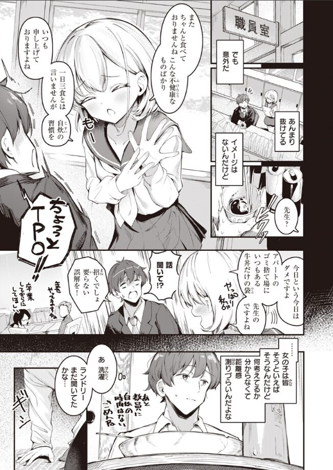 「おてつだい して差し上げましょうか」尽くしてくれる年下糸目女子は好きですか♪新任教師・玉原(たまはら)は、アパートの隣室に住む女生徒・清水冬霞(しみずとうか)からの熱烈なお節介に手を焼いていた。ある雪の晩、鍵を忘れて家に入れず、ドアの前で凍えている冬霞を見つけた玉原は放っておけず彼女を自室に連れ込んでしまう。お風呂で身体を温めた冬霞は、なんと彼のワイシャツ一枚で現れて……玉原の目に飛び込んでくるのは、シャツからこぼれる冬霞のおっぱい。その視線に気づいた冬霞は、膨らんだ股間にそっと手を伸ばし……