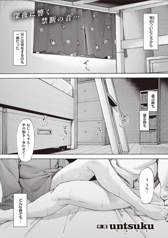 「……おにーちゃんっ……あづのここ見て……?」 親に愛されずに育った杏月(あずき)と光葵(こうき)の兄妹は、お互いの自慰行為を見せ合うことで絆を深めていた。このままの関係がずっと続くと思っていた矢先、兄から「恋人ができたので関係を終了したい」と告げられた。 心の支えを失った杏月は、2人が育った二段ベッドでオナニーをしていると、そこに兄の友人の佐々木(ささき)が現れ……。
