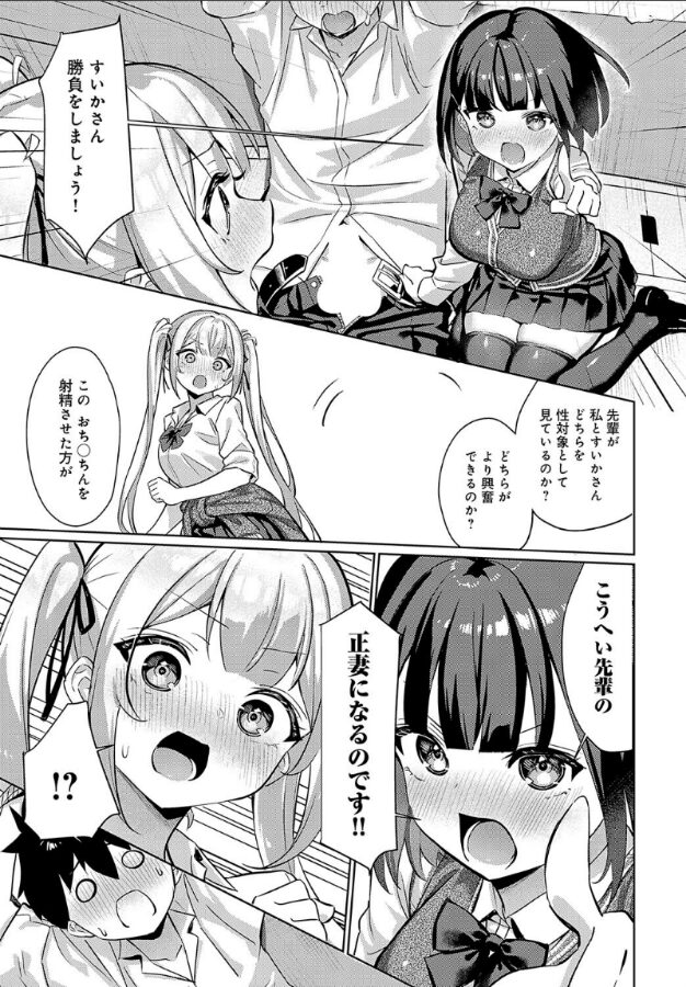 歳下幼馴染・みかんと同い年の幼馴染・すいかに「どっちをお嫁さんにしてくれるの!?」とずーっと迫られている主人公・こうへい。いつまでも一人を選べないこうへいに、痺れを切らした彼女たちは「こうへいを射精させた方が正妻になる」というハチャメチャな勝負を開始!? フェラやパイズリで競い合う二人だが決着はなかなかつかず…。最後には「こうへいとの赤ちゃんが出来たら勝ち」として挿入し始めるけど…それってただのSEXでは!?ポップなもち肌マエストロ・よこやまんじろう先生が贈る、俺のこと好き好き幼馴染に迫られて3P…♪